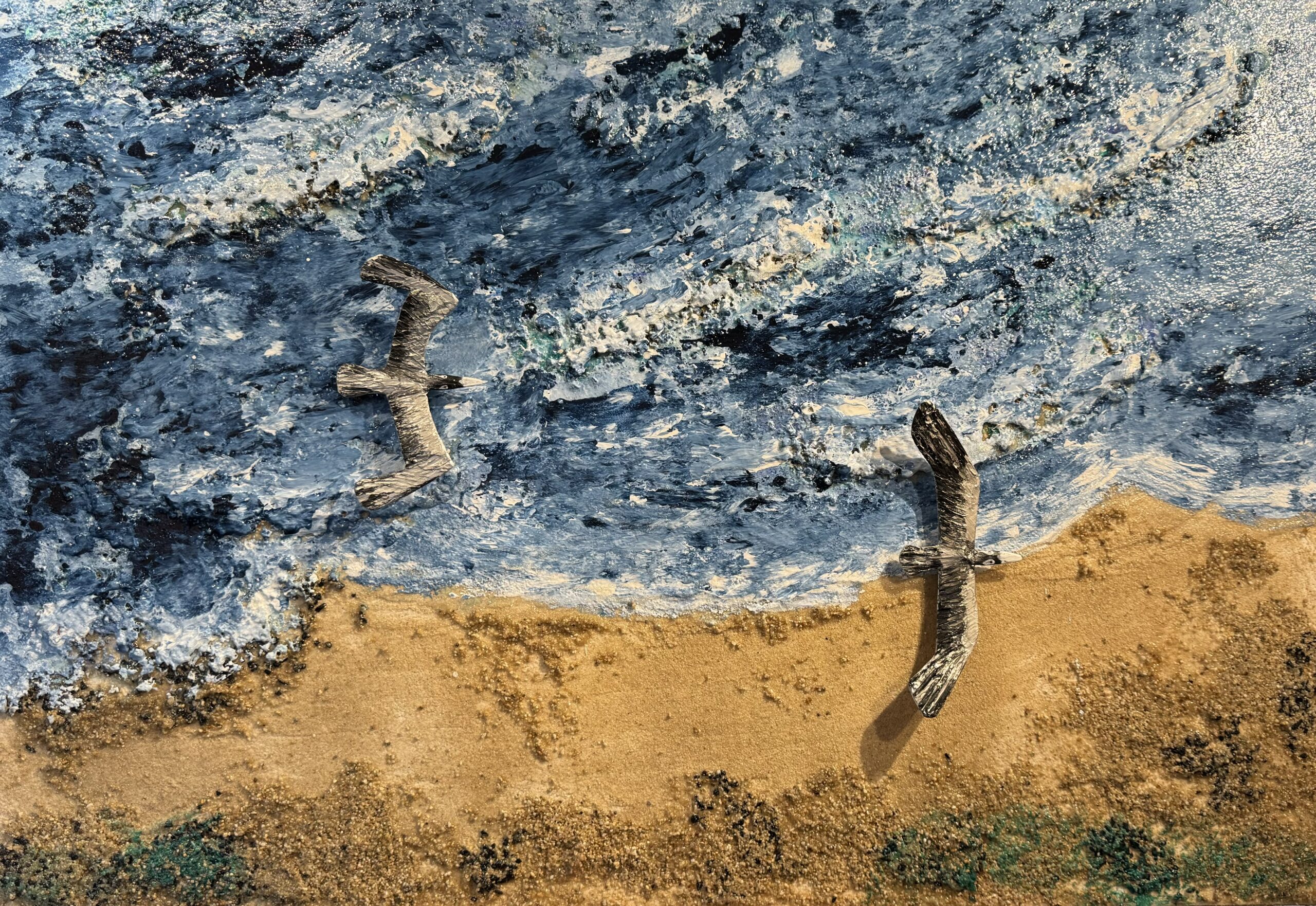 Als Beispiel hier das Bild „West Palm Beach“. Die beiden Vögel lassen sich beliebig auf dem Kunstwerk platzieren. Sie haften durch starke Magnete. Das Bild wurde auf einem Holzmalkörper gemalt und auf der Rückseite mit dünnem Stahlblech versehen.